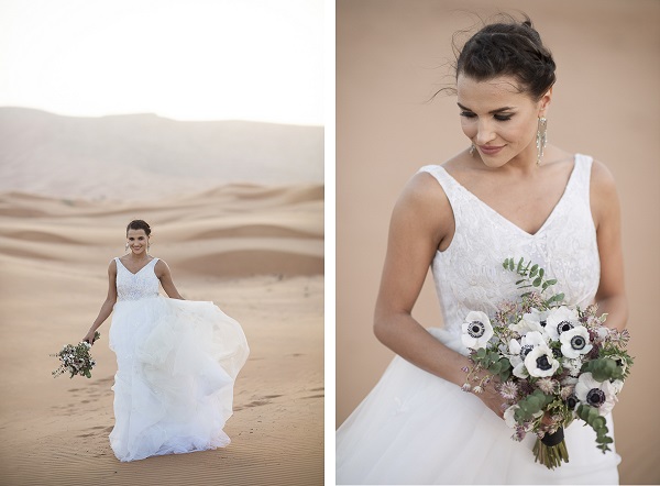 We topped off both looks with jewelry provided to us by Dalia Hamdallah – the owner and founder of D Jewellery. All of Dalia’s pieces are hand-made and inspired by ethnic and African jewelry, as well as semi-precious stones. The model was from Muse Dubai – a talent management and PR agency aimed at representing fresh local and international talent – and they didn’t disappoint. Maria, our model, was gorgeous and a pleasure to work with. She handled the heat, sand, and an over-excited puppy with grace. The makeup offered understated glamour. As a wedding planner, I do tend to avoid making overly bold statements in styling for shoots, preferring to keep the style beautiful rather than overpowering, and our lovely make-up artist, Melissa from Makeup by Base Studio, delivered just that.