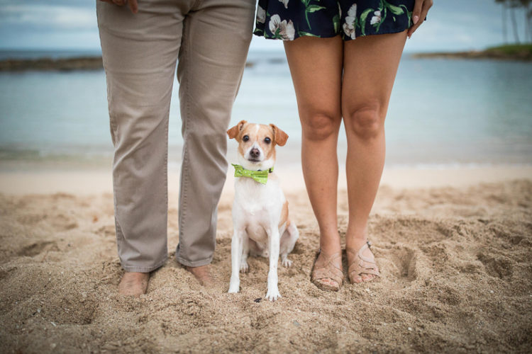 Marley joined his humans for their engagement session with VIVIDfotos on the beach in Kapolei, Hawaii. Marley is a Jack Russel mix and looks so dapper in his bow tie.From Melissa: "Nicole and Tyson decided it was only right to bring their fur baby to their engagement shoot. They rescued him together from the Willamette Humane Society in Oregon and moved back with him to their home of Hawaii. They dressed him to the nines in an adorable green bow tie with polka dots, and he behaved ... continue reading
