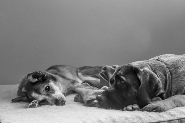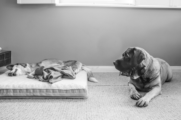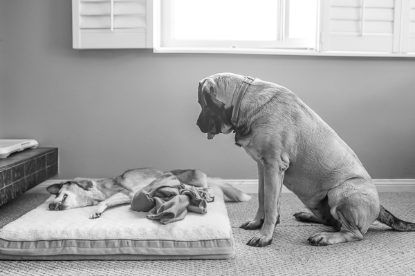 She made herself comfortable on an oversized bed, met my three giant fur-kids, and seemed to feel at home. Pax turned out to be a champion photo-editing partner, snoozing on her bed while I worked. She got cheeseburgers for dinner and her fill of ear scratches and snuggles. Kimber, in particular, took to Pax – at first wondering why she wouldn’t play, but quickly realizing Pax demanded a gentler friend. When I went home at lunch to check on Pax, she had taken a turn for the worse. I took her outside for some sunshine and settled her on her comfy bed. They say a picture is worth a thousand words, so I’ll let Kimber and Pax tell the end of the story of a fast friendship and an unlikely pair – a rambunctious Mastiff and a hospice senior who were together only a few days, but together til the end.