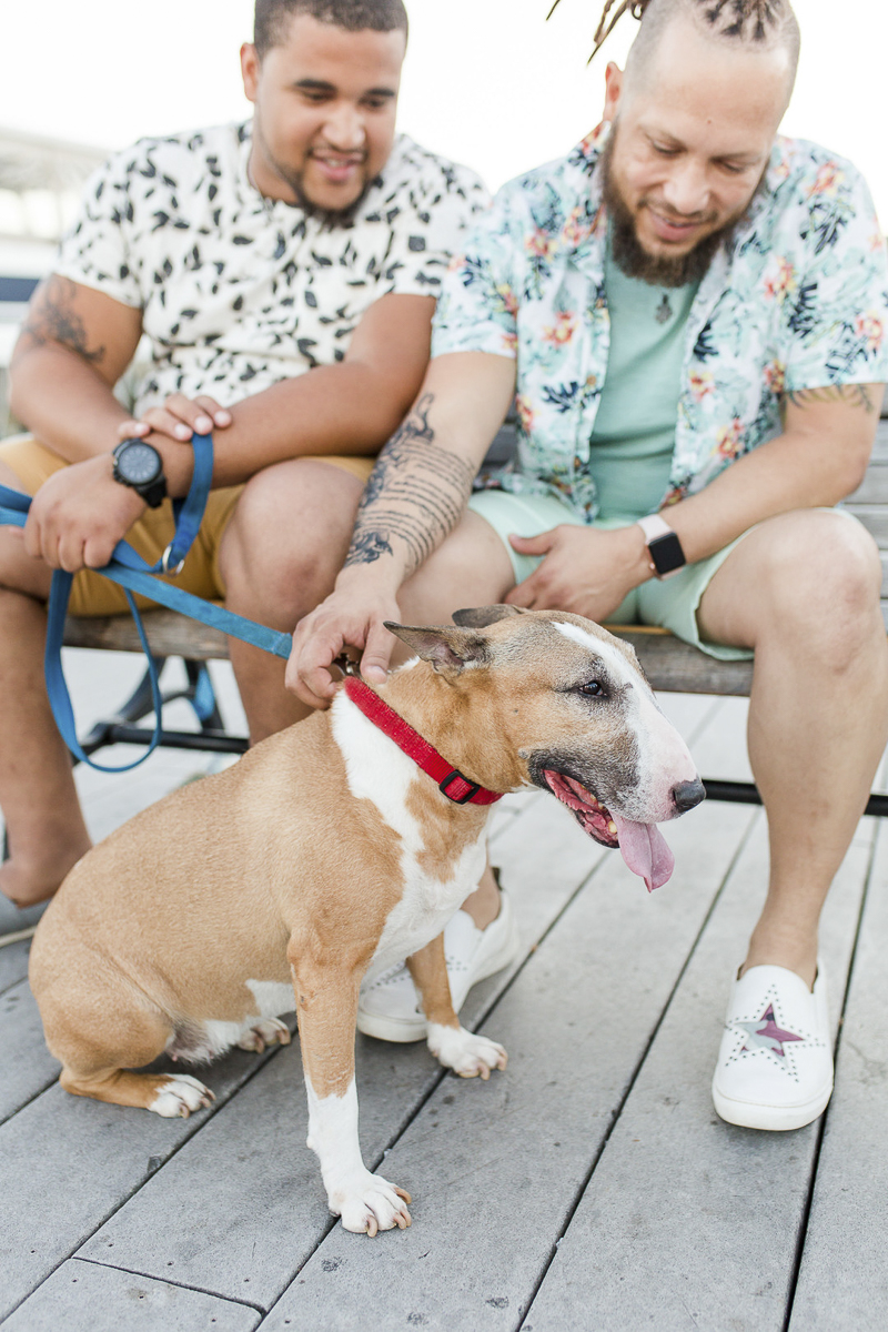 This lovely Bull Terrier, Shooter, had a family photo session with both her dog dads and Megan Rei Photography. It looks like they all had lots of fun.