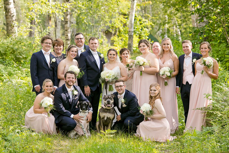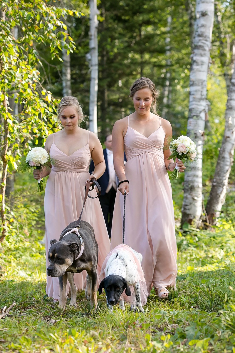 This couple found the perfect location for their dog-friendly wedding, in a beautifully wooded area in Duluth, Minnesota. A loving couple, pink details, lovely florals, gorgeous woods, and two cute pups were the perfect subjects for Twin Cities wedding photographer, Jeannine Marie.