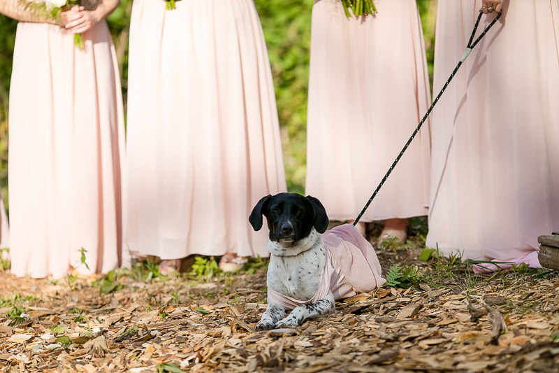 What a beautiful venue. I love the pale pink dresses with the woody background. I love it when people can include their pets at weddings.