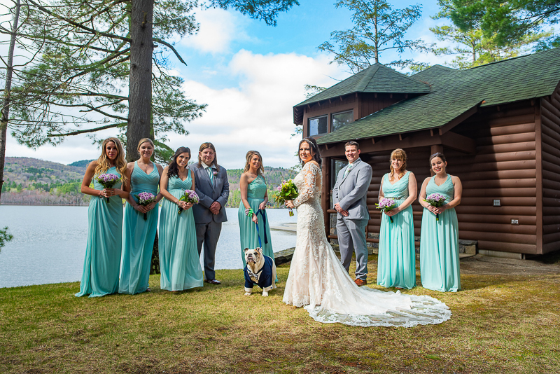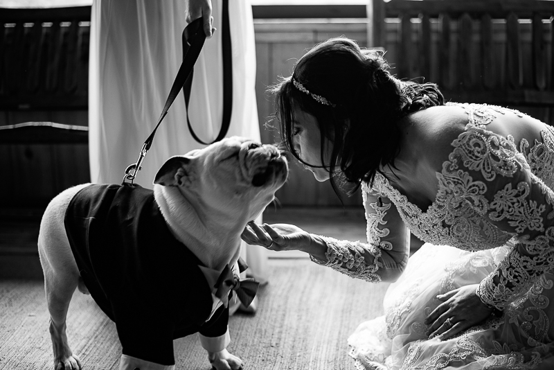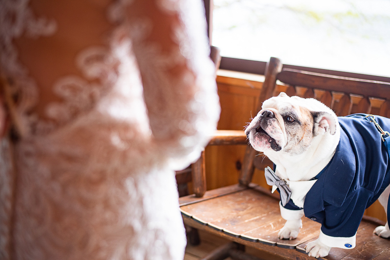 Xavier, the English Bulldog, has an adorable smile and was the best-dressed wedding dog, with a navy tuxedo, gray bow tie, and blue cufflinks. New York-based, wedding photographer, Ray Alvarez, photographed Michelle and Will’s wedding at Brant Lake, New York.