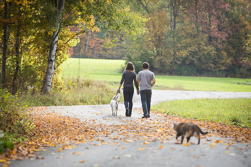 After capturing images in the colorful fall foliage around their beautiful hilltop house, we headed to downtown Quechee, Vermont, to capture more engagement photography near the Quechee Covered Bridge and Simon Pearce falls. This family is so full of love, laughter, and they are devoted to their fur-babies.