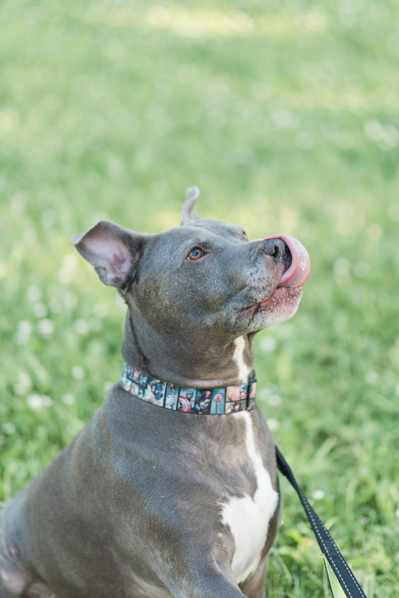 You look like a very adorable family. Dog seems to love you very much. That Marvel inspired dog collar is fantastic!