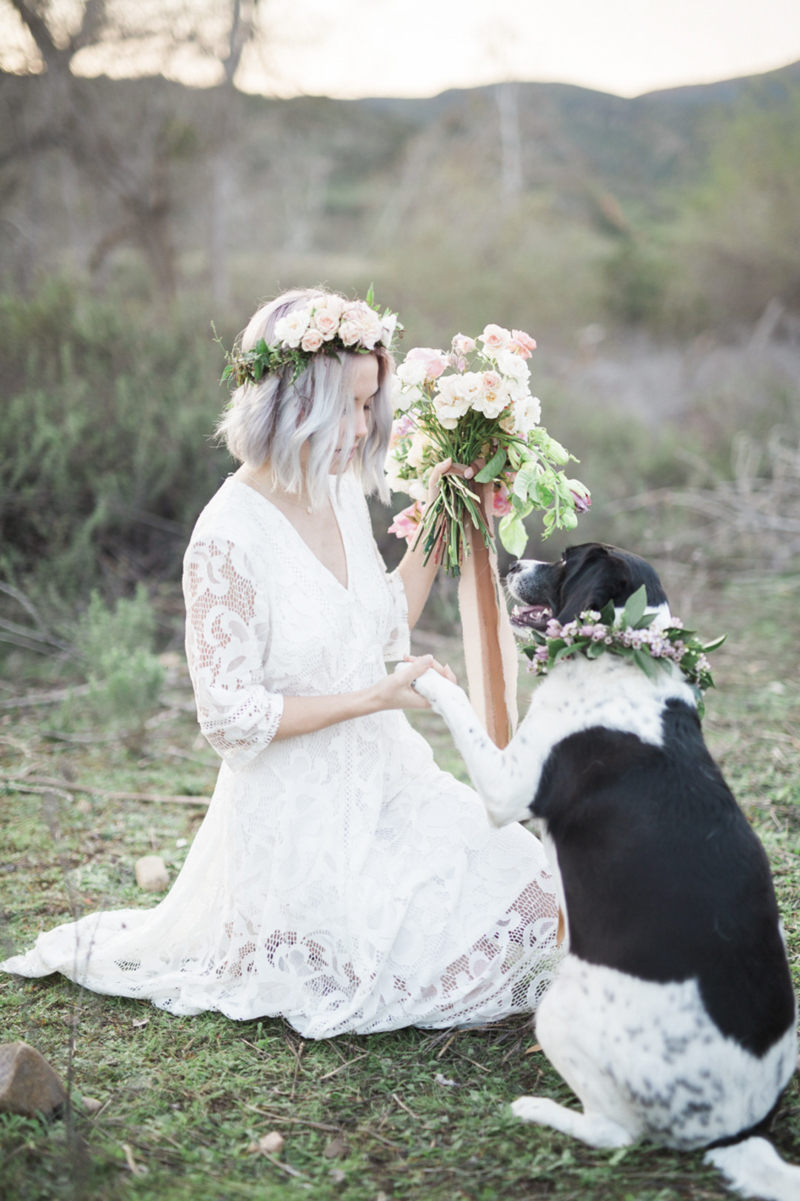 If you love dogs (which hopefully you do since you are here) and flowers, you’re going to love this dreamy styled shoot from My Sun & Stars. San Diego Wedding Photographer, Megan Lynn, teamed up with Botanica Muse for a gorgeous portrait session. Megan’s dogs, Nigel and Fox, modeled along with one of Megan’s friends and fellow dog enthusiast. Last but not least, I love her dress and floral accessories!