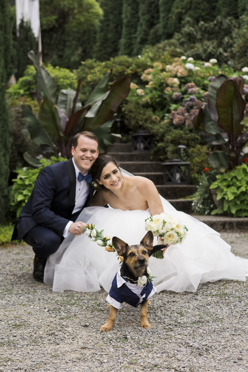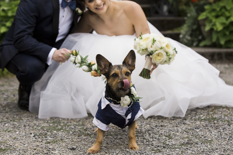 Rescue dog Teddy, the Silky Terrier-Schnauzer mix, is a big part of Chris and Evita’s life, so naturally, it was important to get some wedding photos with him. Teddy looked especially dapper in his matching tuxedo and a gorgeous floral leash. Teddy isn’t a big fan of crowds, so he didn’t attend the ceremony. Happily, Stephanie Cristalli Photography got some great photos of the three of them in their wedding attire.