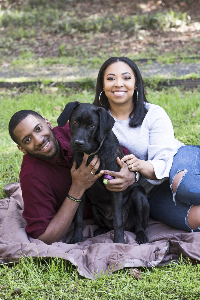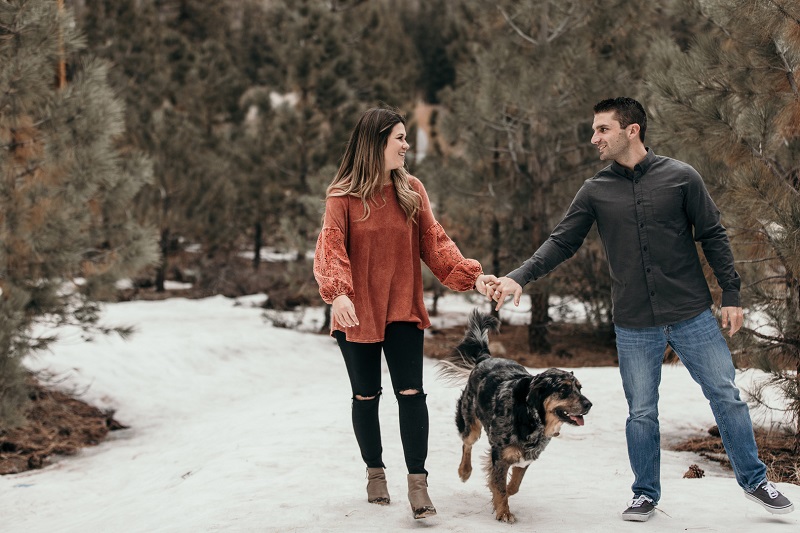 If you have a well-trained dog, then you’re going to have a fantastic time! But, if your dog is like mine, an extra pair of hands will help. If possible, bring someone your dog knows and trusts. Practice some basic skills before the day of the engagement shoot. Bring treats with you along with your dog’s favorite toy. Squeaky toys are a great way to get a dog’s attention.