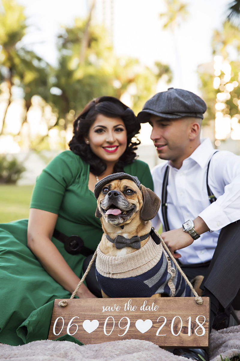 I love seeing dogs in bow ties and floral collars. If you purchase something new for the shoot, be sure it fits your dog comfortably. Give your dog some time to wear it (or something similar) at home so you don’t overwhelm with your dog with too many new experiences at once. I am a huge fan of Save the Date signs, but again, be sure your dog is okay wearing it or sitting next to it before the shoot. You don’t want to spend your engagement session trying to coax your pup to wear the sign.