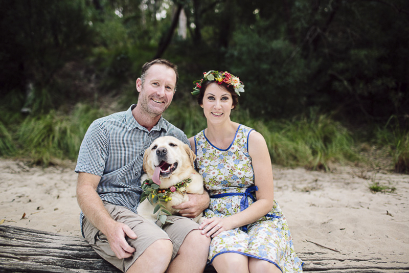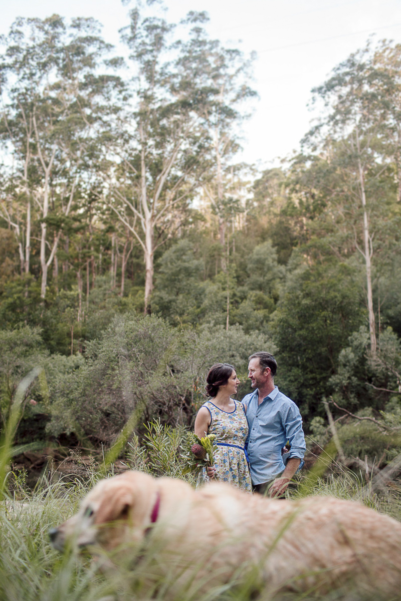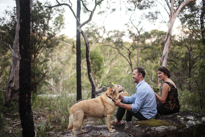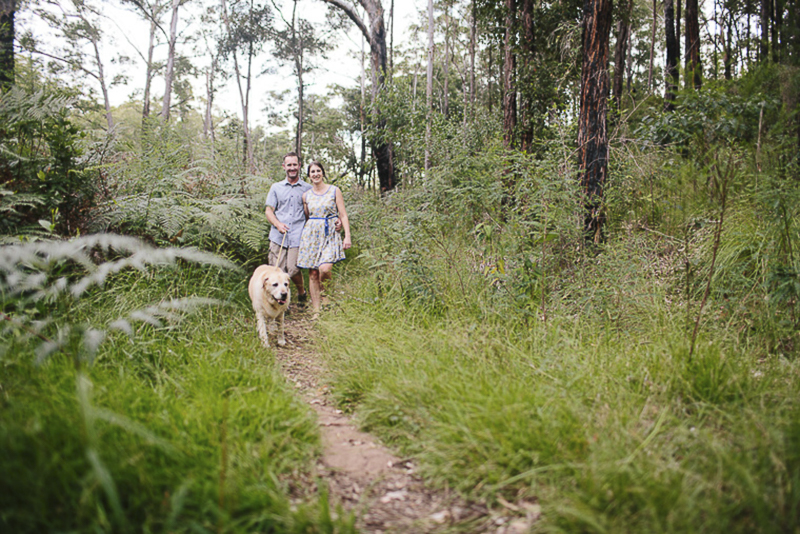 From Hilary: “Laura and Ryan both adore an adventure. Ryan is an avid rock climber, and Laura has a passion for the Australian bush, so for their engagement shoot, they chose a secret bush track in the lower Blue Mountains. Joining them was the most important member of their family – their golden lab called Bridie.