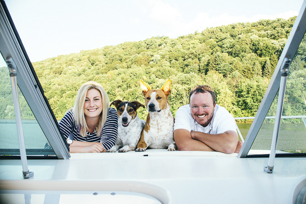 What a beautiful couple and two adorable dogs! The photos with the river are stunning. I’m completley jealous they get to boat in that paradise all the time! Those are some lucky dogs!