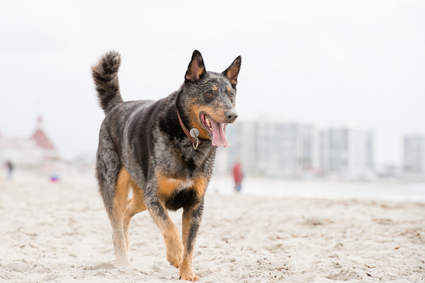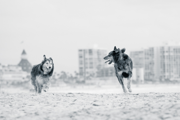 These two have lots of energy and I’m pretty sure they could play all day. We started our session at a park on Coronado Island in San Diego where we had a beautiful view back at the city and some pretty greenery. Bailey and Tucker LOVE the beach, so we headed over there next. As soon as they were let off-leash at the beach, they took off running.