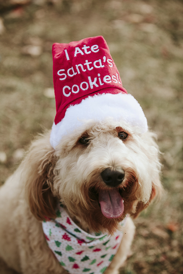 Goldendoodle Teddy has two different pairs of antlers, pajamas, Santa hat and a festive Christmas bandana, but I think his elf costume may be the best I’ve ever seen.