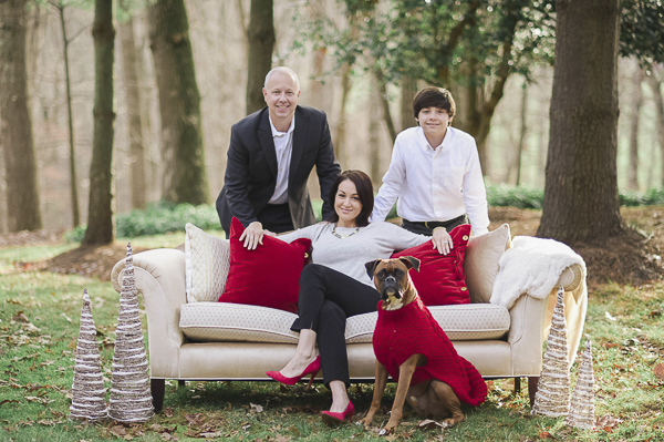 From Laura: “I am excited to share a recent holiday portrait session I did for Walter (the dog) and his humans: Sarita, Scott, and Alex. I hope you love the warm winter colors of red, gold, ivory and silver — perfect for the winter holidays and the start of a new year. Walter did a great job posing for the shoot. We were very blessed to have our session styled by Stash Rentals (vintage luxe sofa, pillows, and decor) and for the gorgeous, rustic backdrop in Wolf Trap, VA.”
