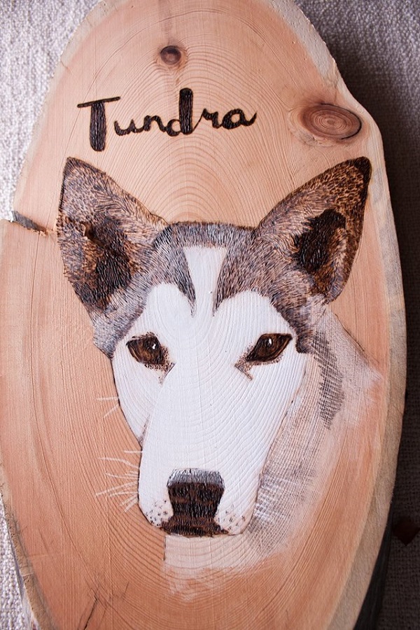 She makes gorgeous custom pet portraits with a wood burner and a pine slab. Eline then adds acrylic paint to bring the pictures to life.