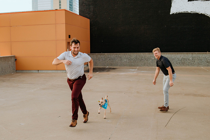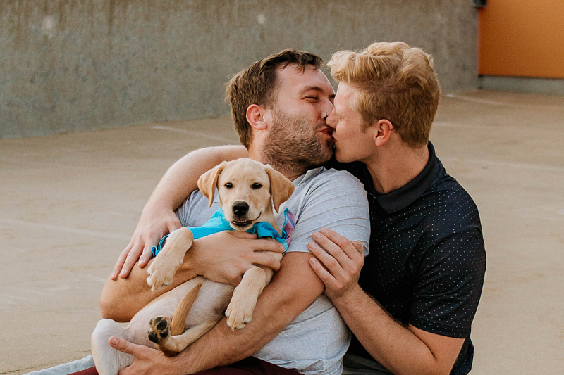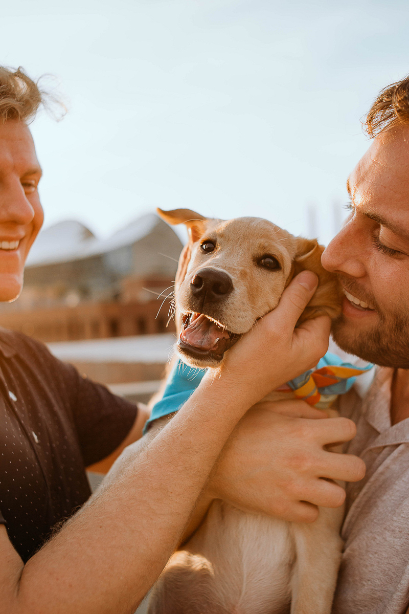 Tucker, the Yellow Lab, is a lucky pup! I love these dog-friendly family photos with Tucker and his dads from Stevie Nicole Photography in Kansas City, Missouri. This session shows so much fun and love between the three of them. (I’m also a huge fan of Tucker’s bandana as well as the black spots on his tongue!)